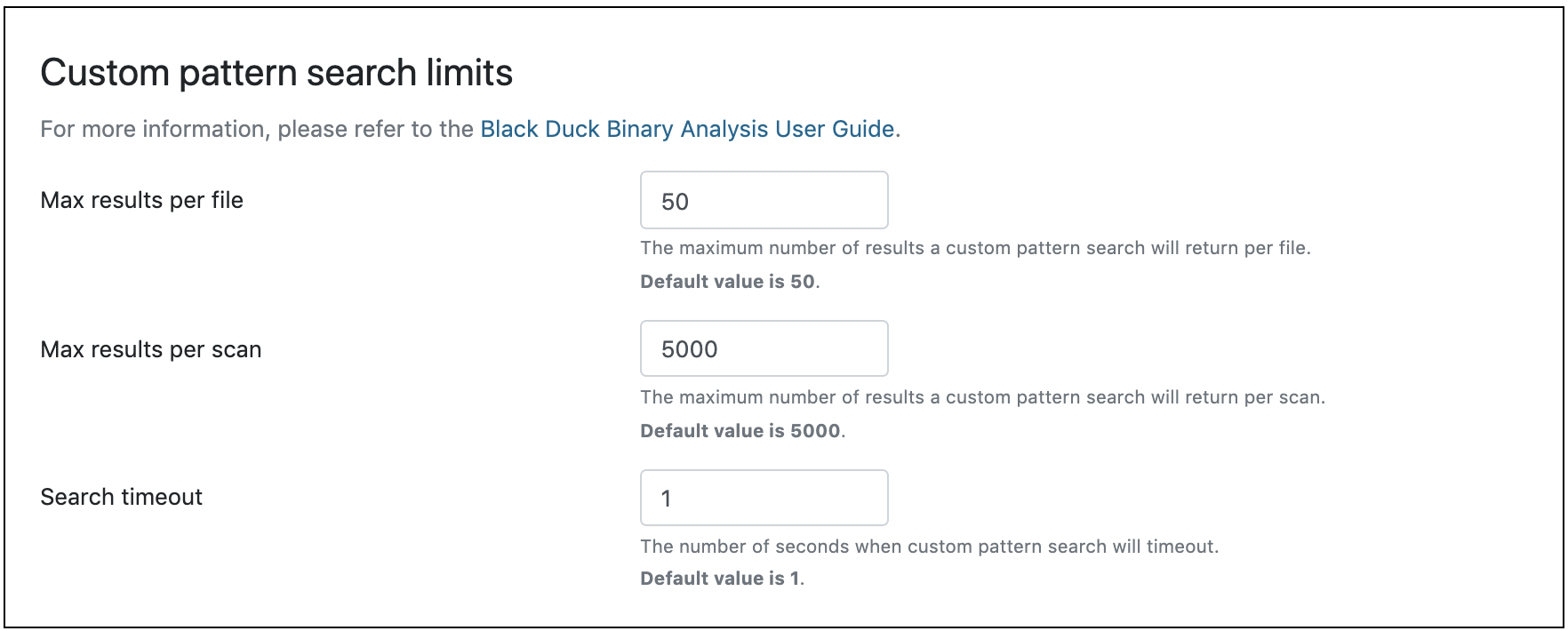 - Under Custom pattern search limits for Information leakage, enter new limits in the text fields for Max results per file, Max results per scan, and Search timeout.